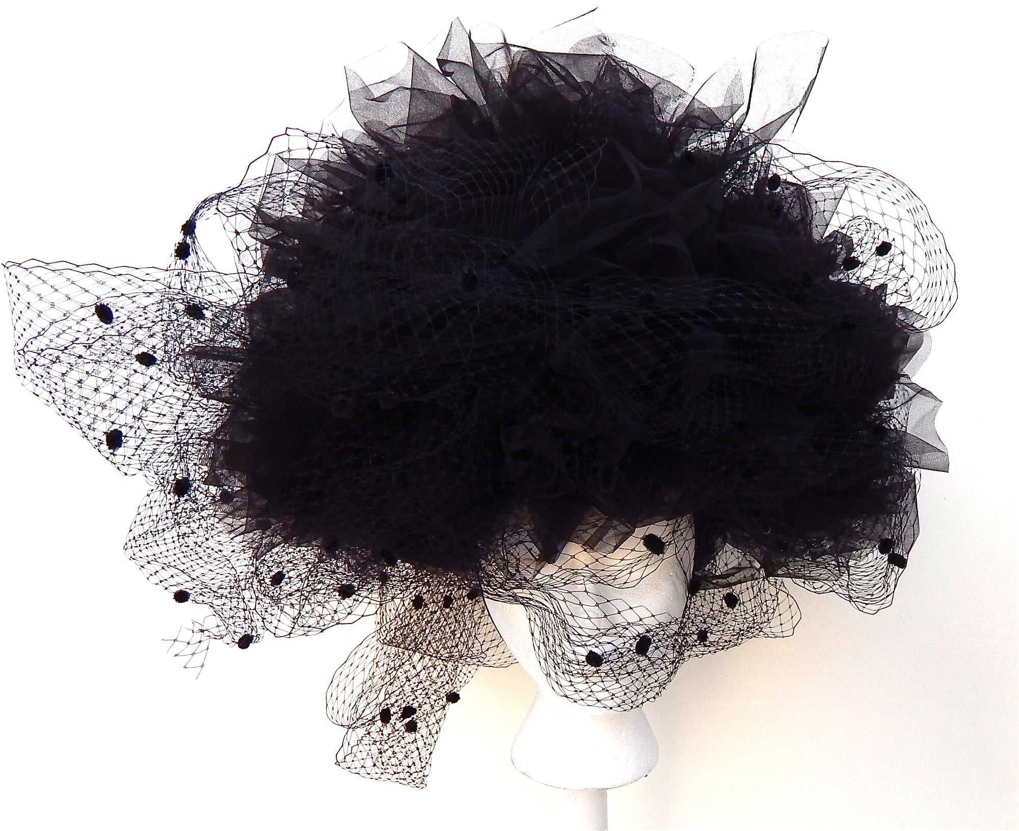 BUCKRAM HAT FRAME COVERED IN BLACK TULLE & RUSSIAN DOT NETTING