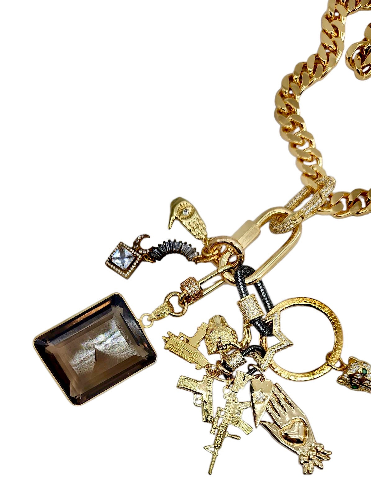 CAN BE WORN AS A NECKLACE, BRACELET AND OR BAG CHARMS. UNCLIP TO RE-ARRANGE AND OR MIX & MATCH.