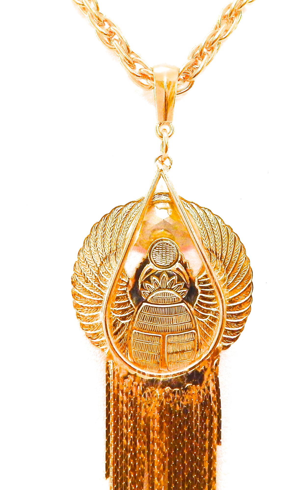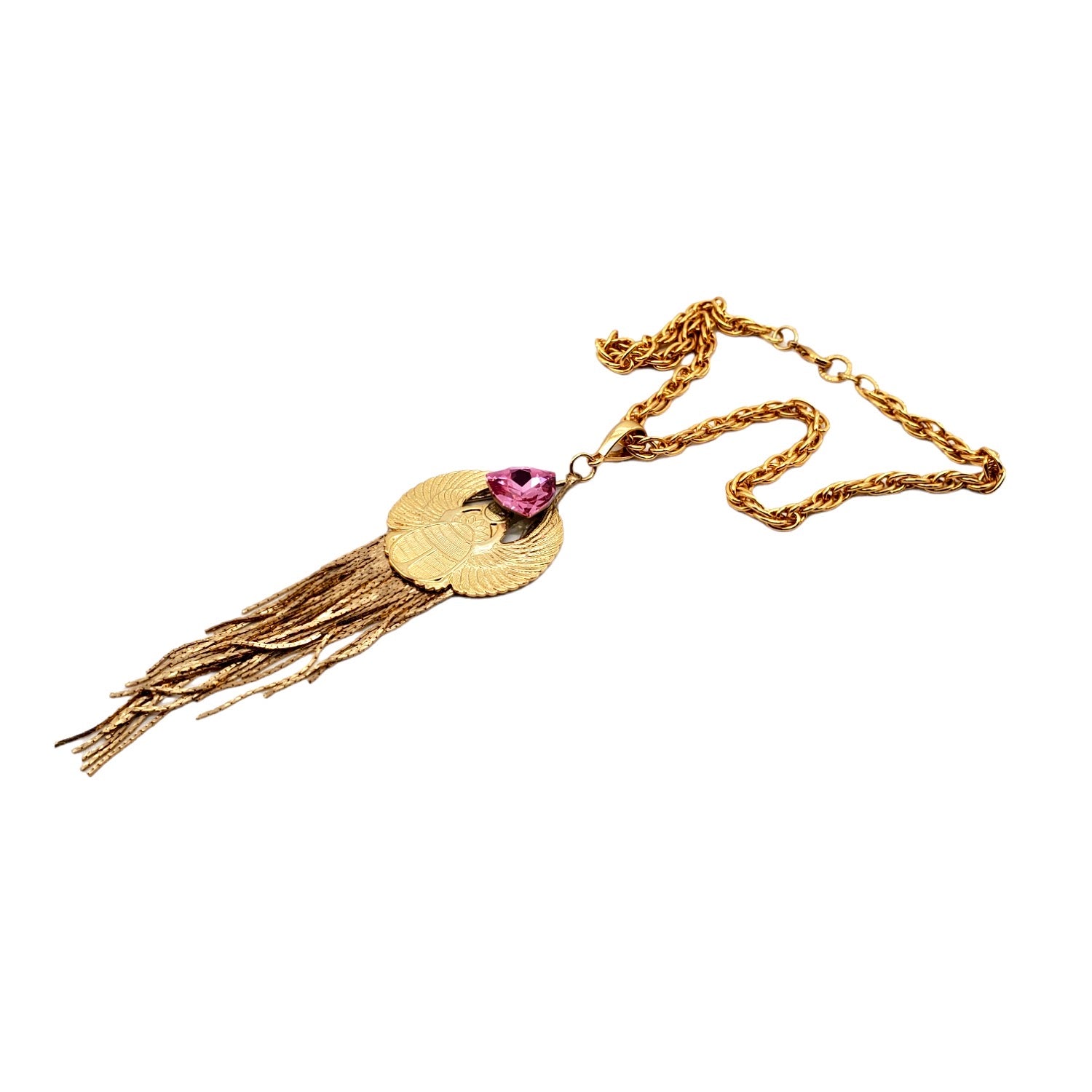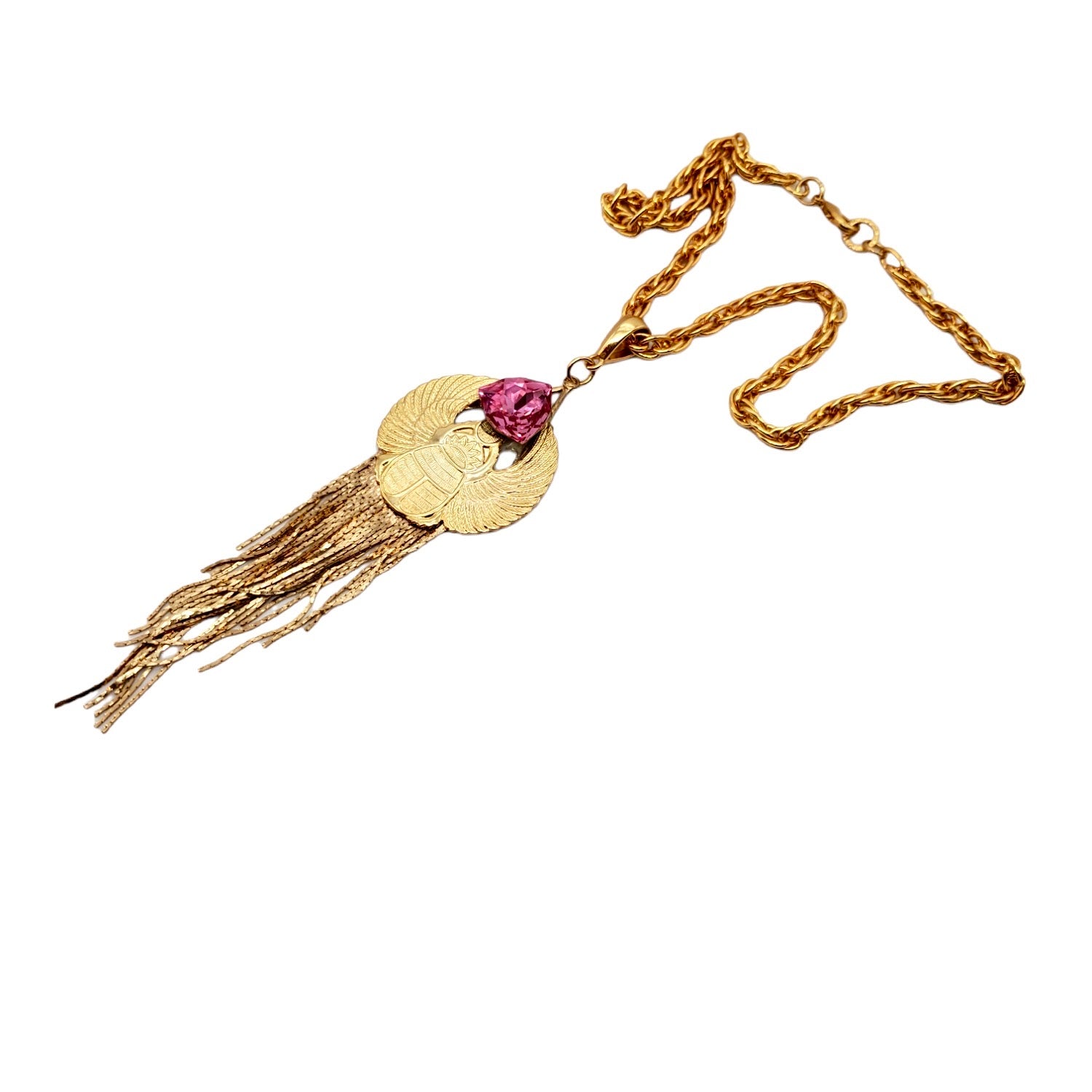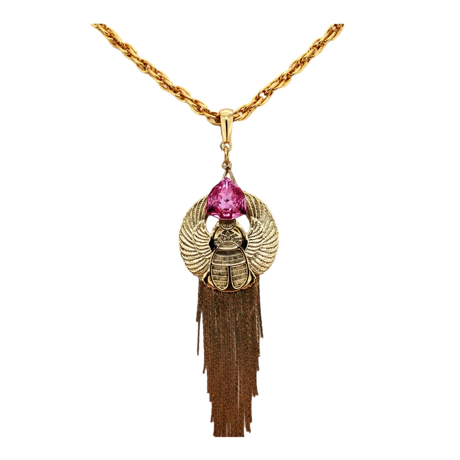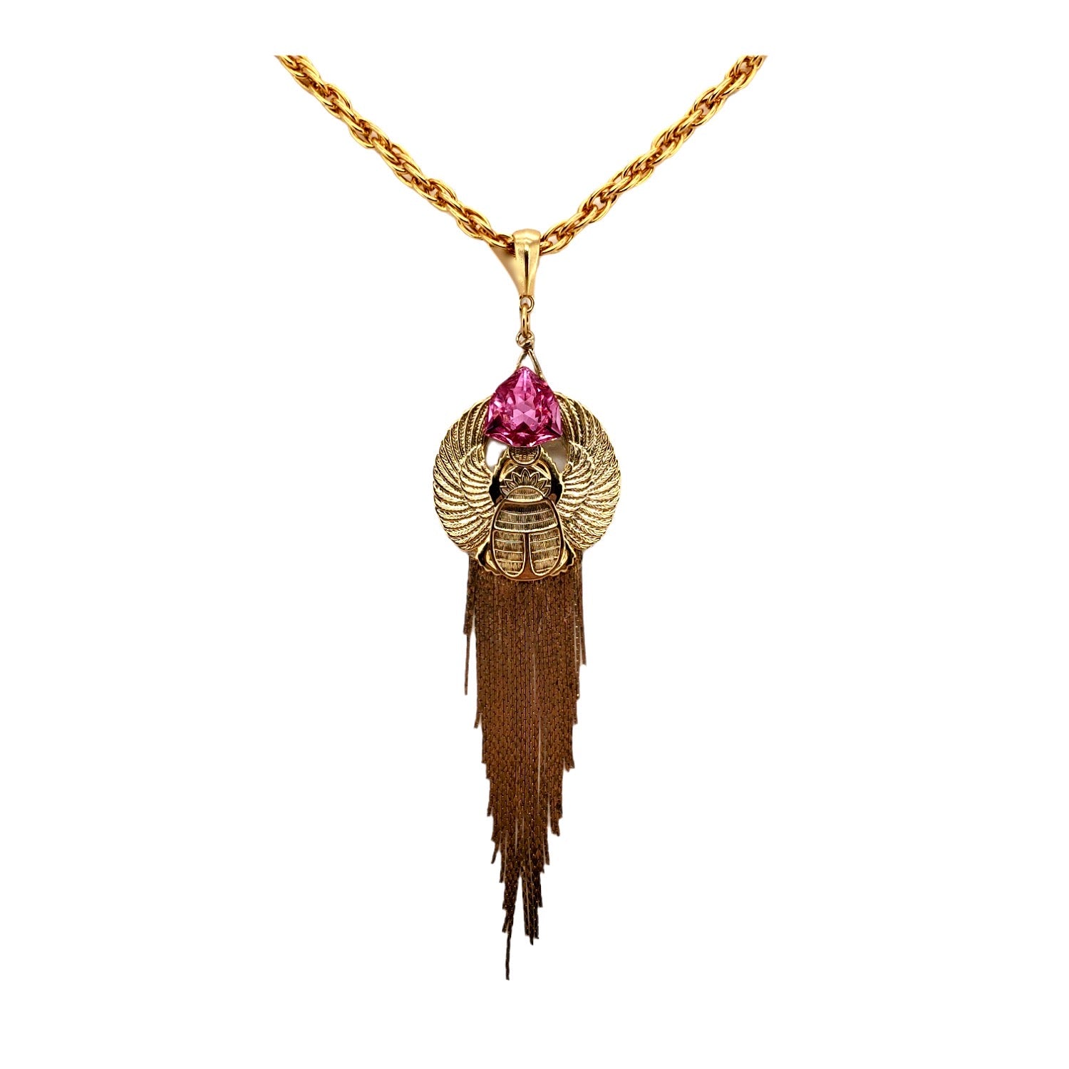 EGYPTIAN GOLD KHEPRI BEETLE PINK FOX FRINGE NECKLACE