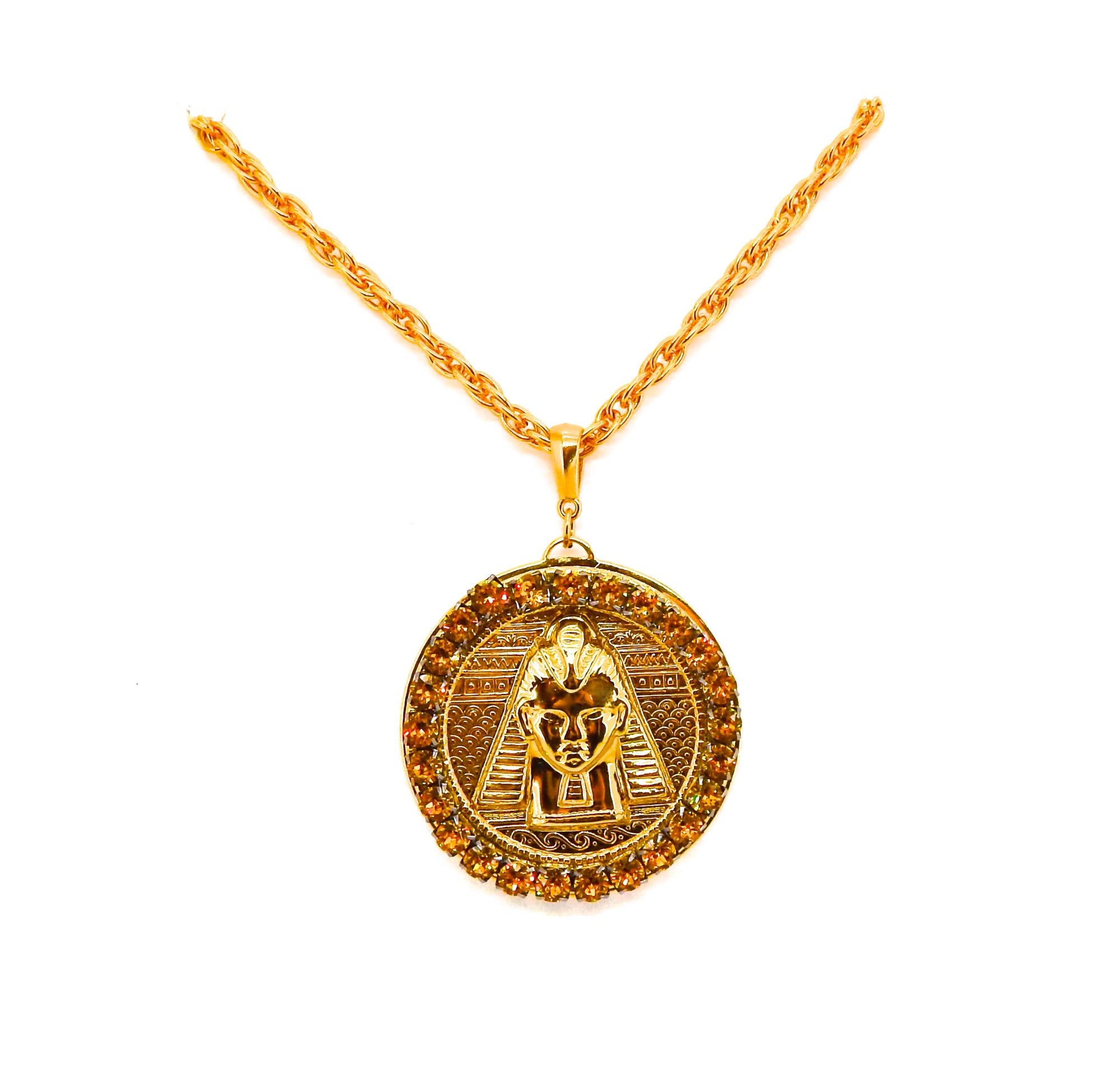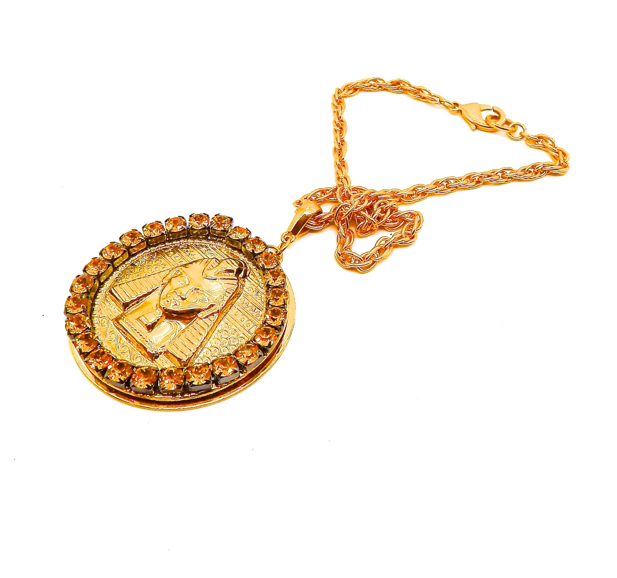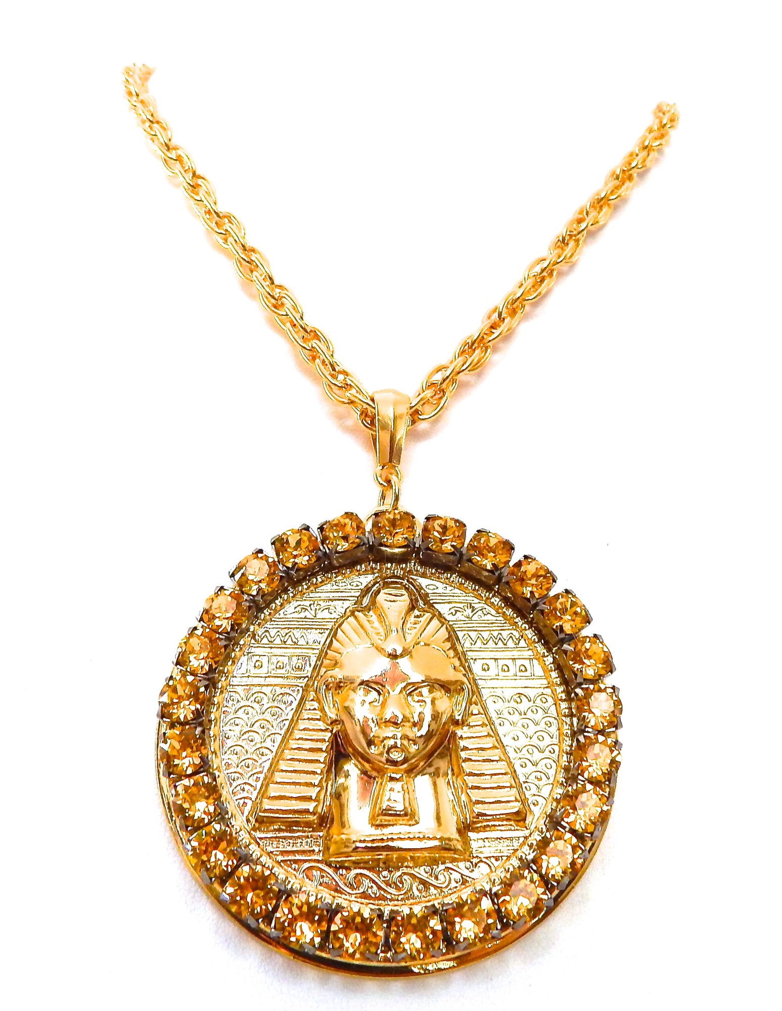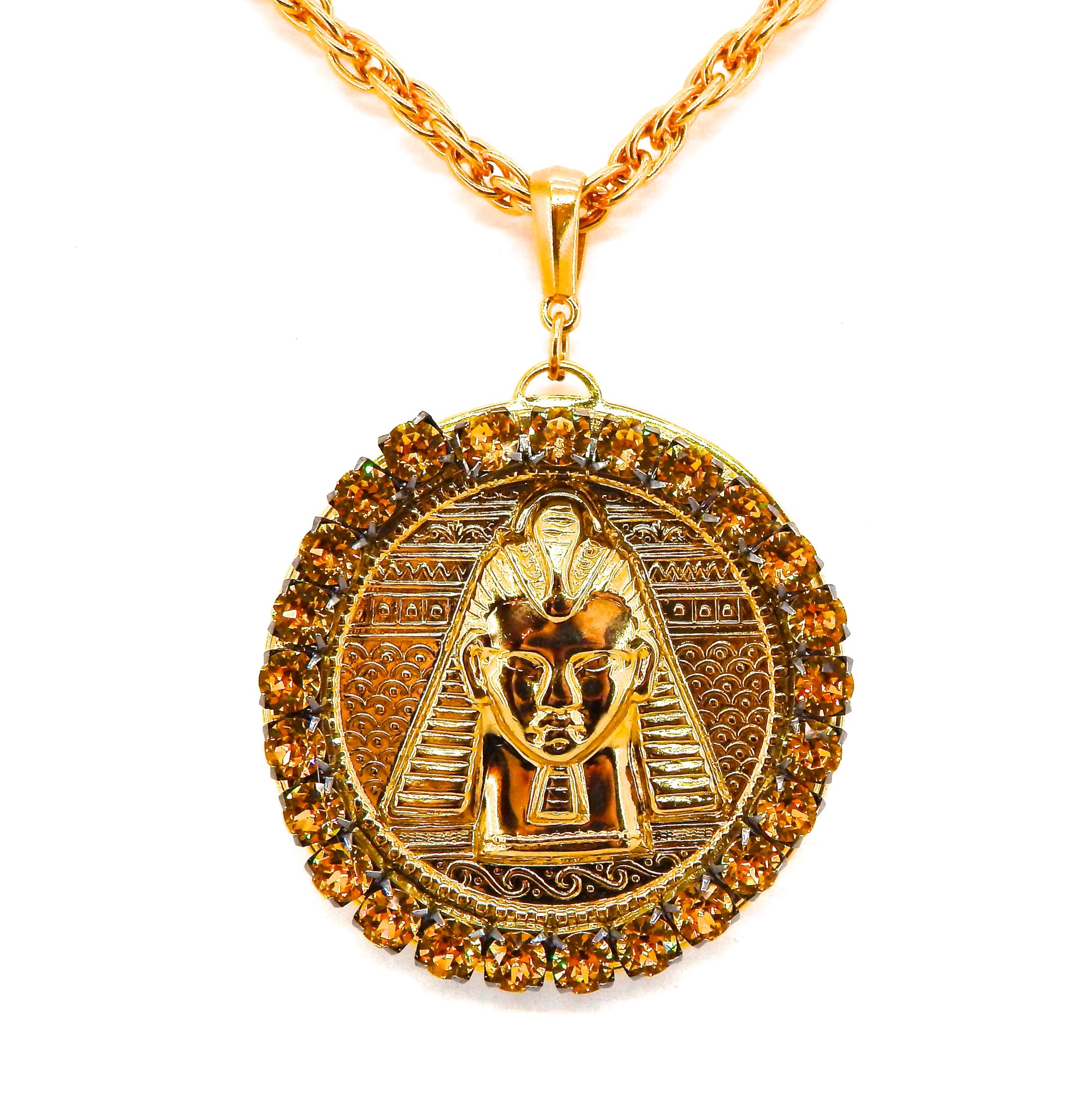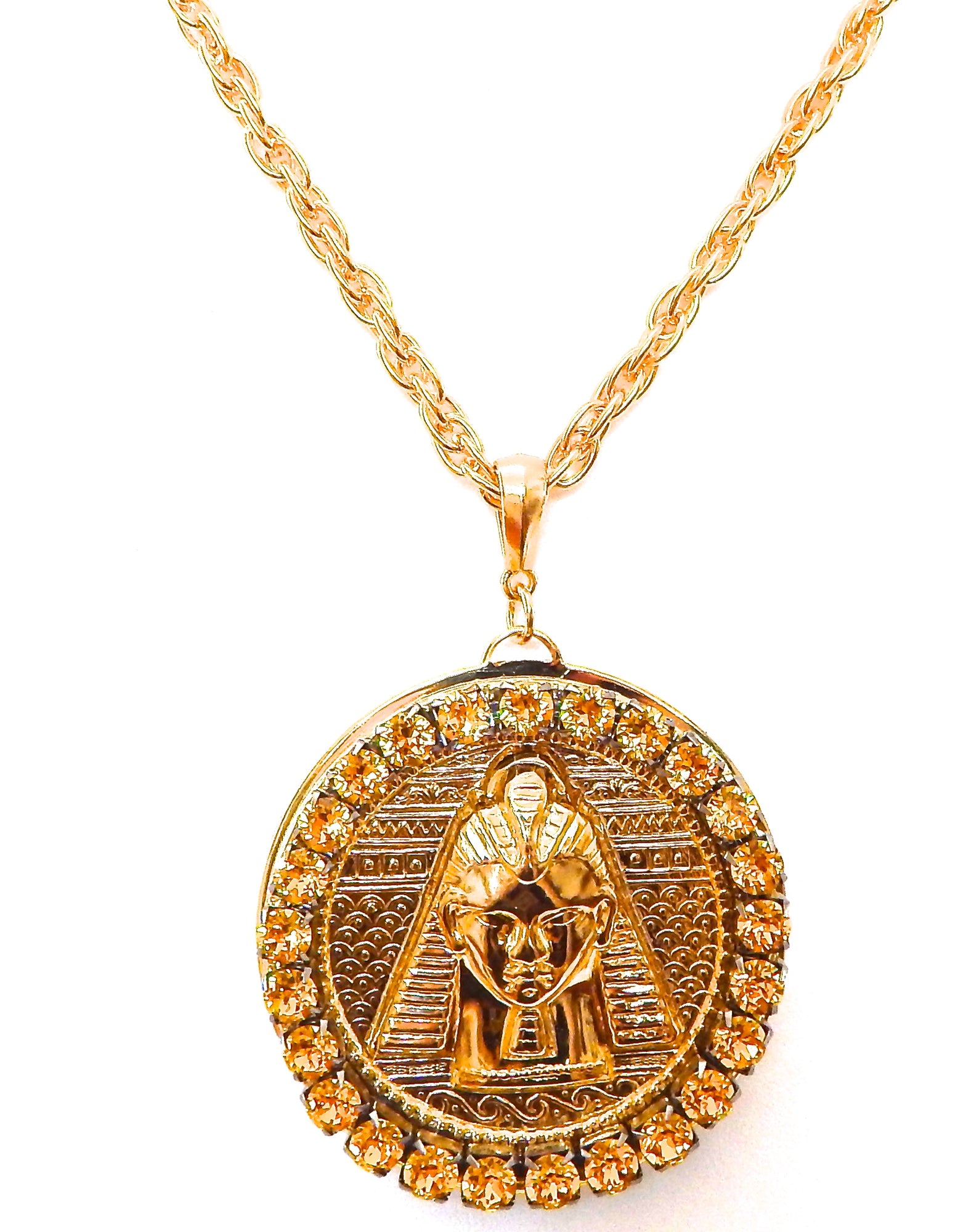 EGYPTIAN GOLD TUTANKHAMUN SUN DUST RHINESTONE MEDALLION NECKLACE