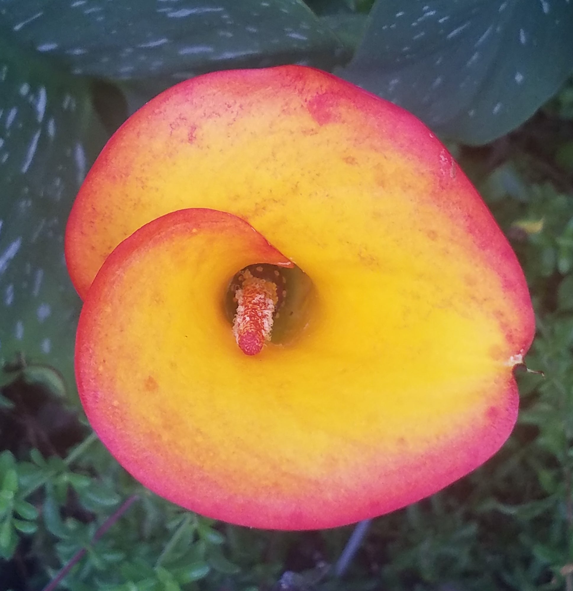 ZANTEDESCHIA AETHIOPICA IS A SPECIES IN THE FAMILY ARACEAE, NATIVE TO SOUTHERN AFRICA IN LESOTHO, SOUTH AFRICA, AND SWAZILAND. FUNNY ENOUGH WHEN YOU ADD WATER TO DIRT YOU NEVER KNOW WHAT WILL SPRING UP, ONE DAY THIS FIREY DUDE POPPED UP AND BLOOMS EVERY SPRING/SUMMER. I HAVE NO IDEA WHERE IS CAME FROM.