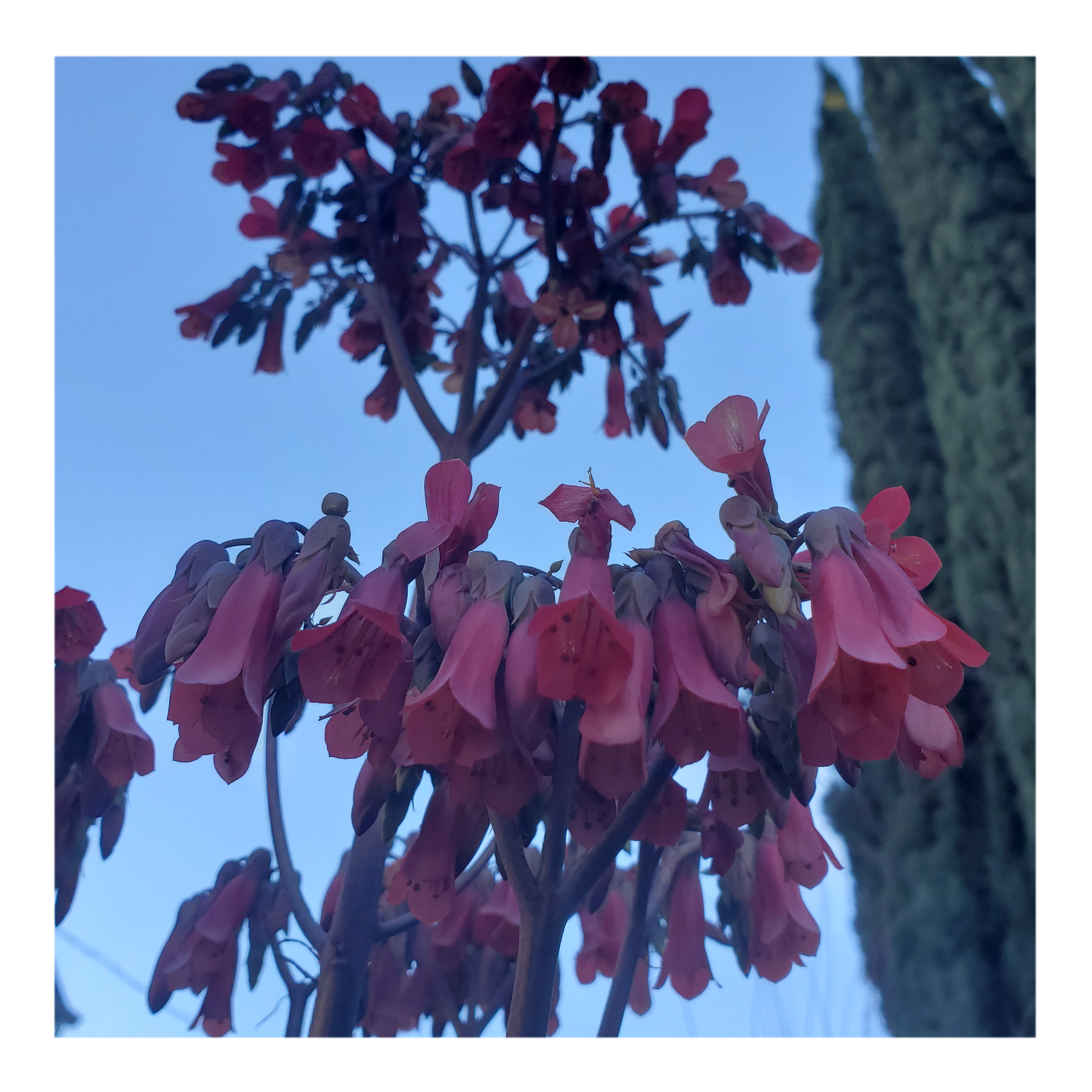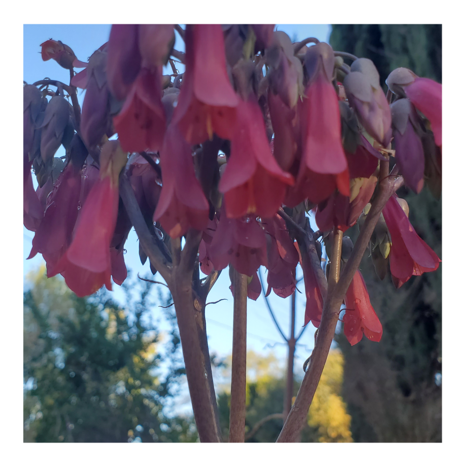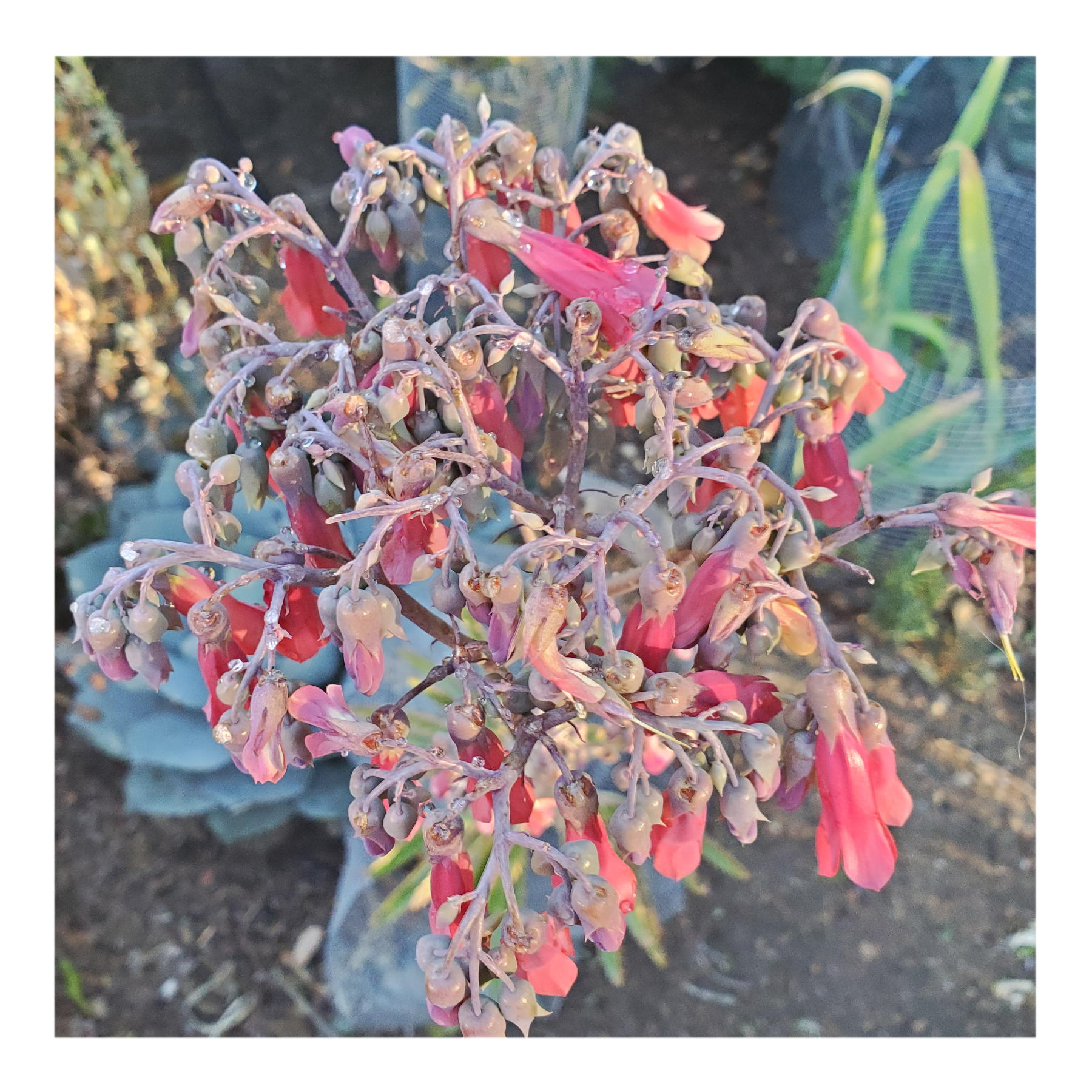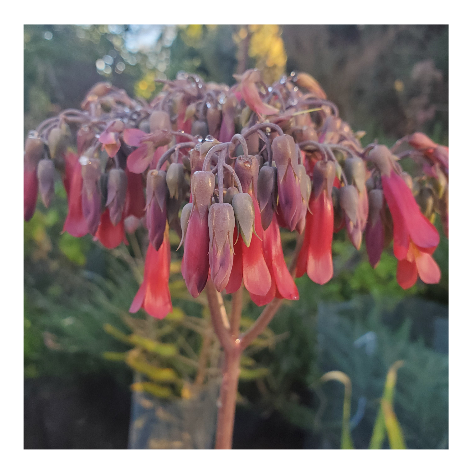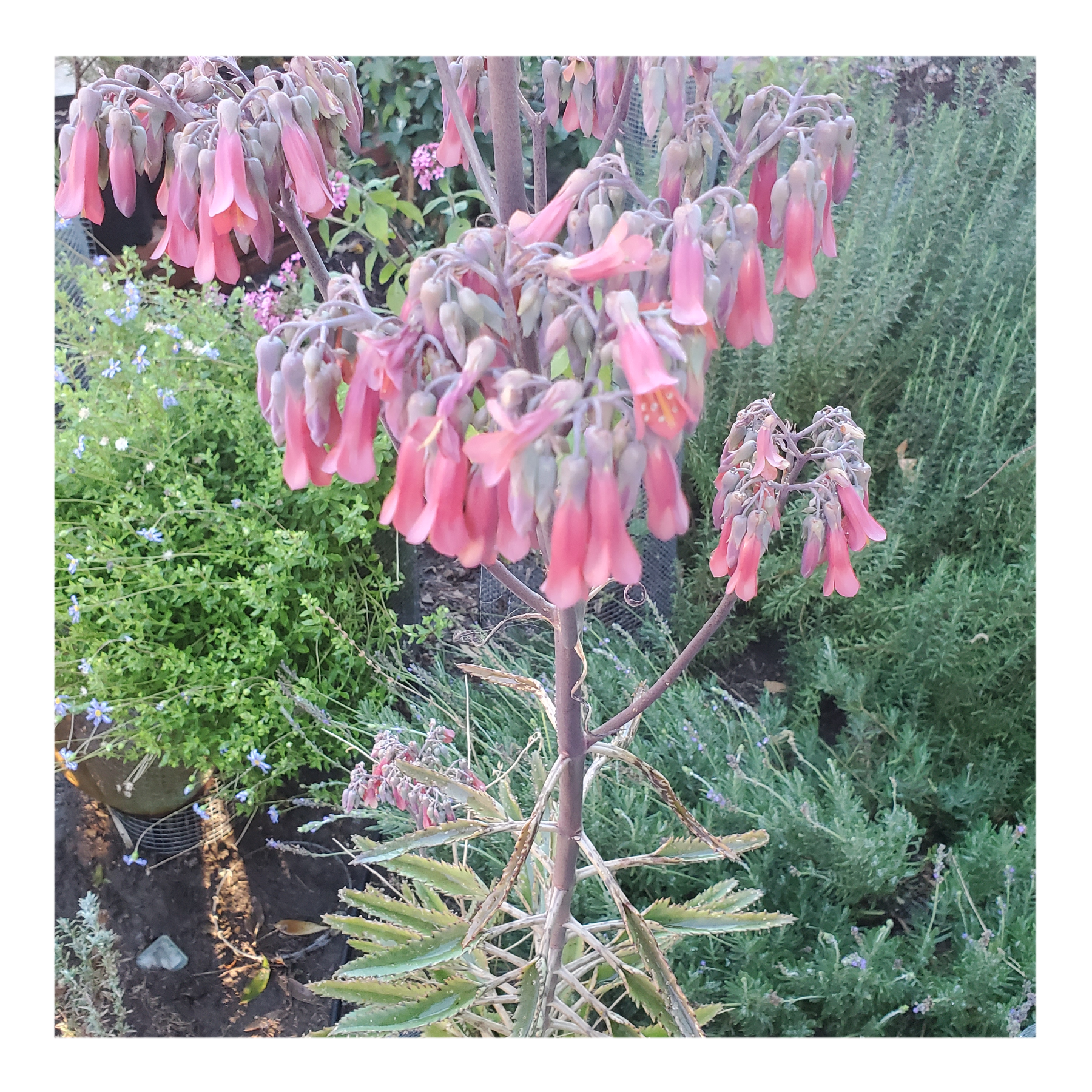 BRYOPHYLLUM DELAGOENSE IS A SUCCULENT PLANT NATIVE TO MADAGASCAR. IS NOTABLE FOR GROWING IN SMALL PLANTLETS ON THE ENDS OF ITS PHYLLOCLADES, LEADING TO ITS COMMON NAME OF MOTHER OF MILLIONS, DEVIL'S BACKBONE AND CHANDELIER PLANT. DROUGHT RESISTANCE, TAOXIC TO LIVE STOCK AND OFTEN POLLINATED BY HUMMINGBIRDS.