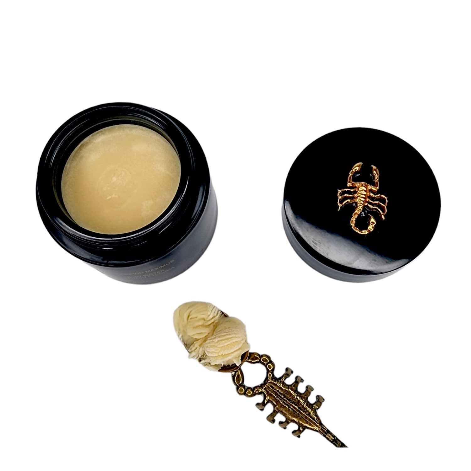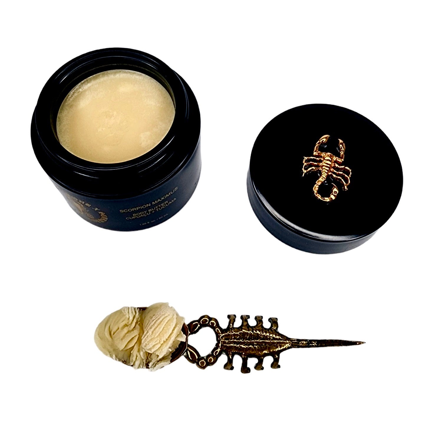 SCORPION MAXIMUS BUTTER ORIGIN STORY: POWERFUL SCORPION MAXIMUS BODY BUTTER IS AN INSANELY RICH, THICK & CREAMY, EARTHY, NUTTY WHIPPED BODY BUTTER THAT WILL LEAVE SKIN SOFT, SUPPLE, SMOOTH & HYDRATED. THE ULTIMATE WEAPON FOR DRY SKIN.